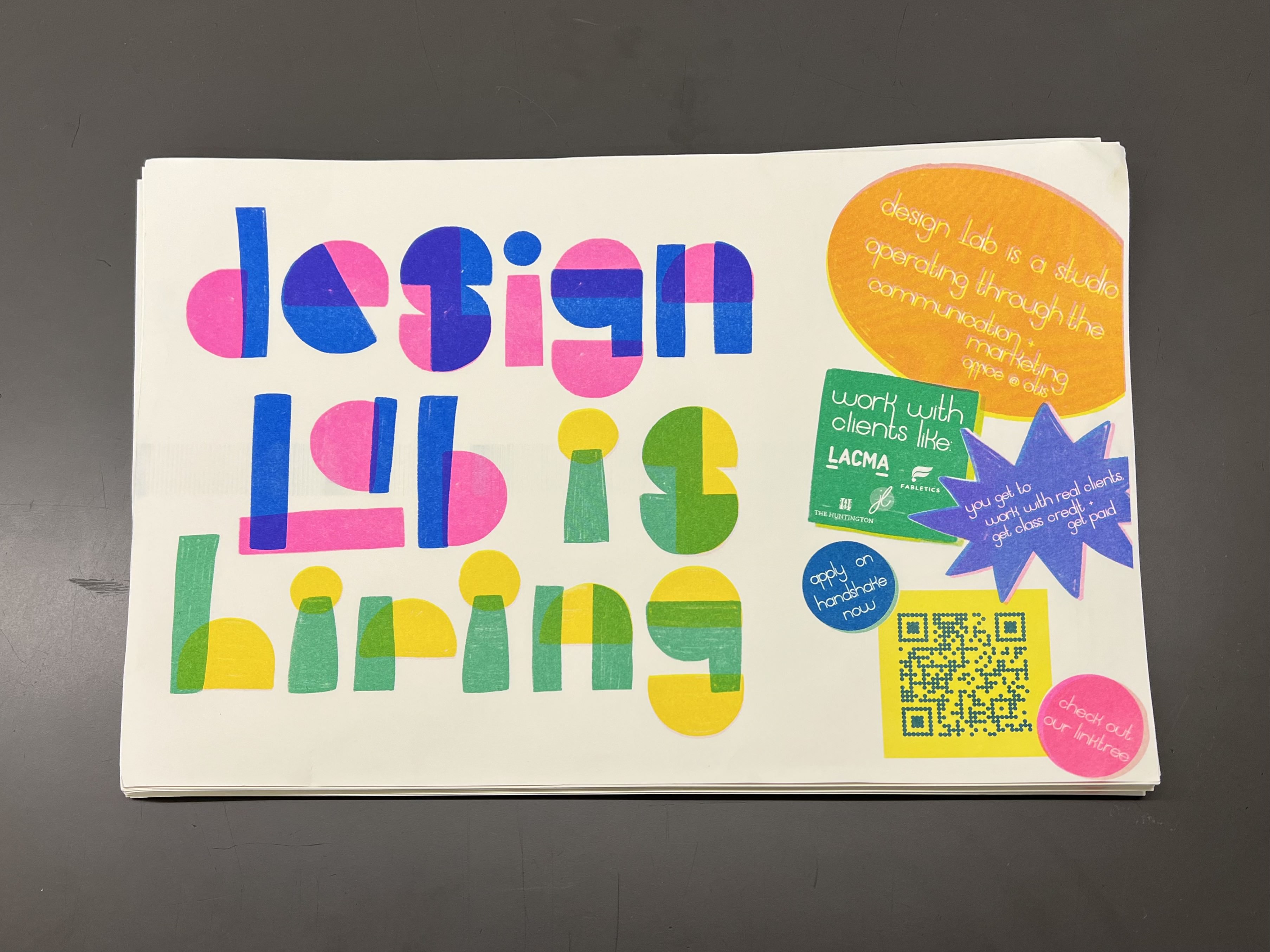 Before graduating college, we were tasked with promoting Design Lab to current Otis students, as all of Design Lab was hiring 2023. I decided to hand-design type by using different shapes and colors. I made sure to have pieces that overlapped, so once printed with the RISO process, the layered colors would blend into new shapes and colors while still being readable as letters.