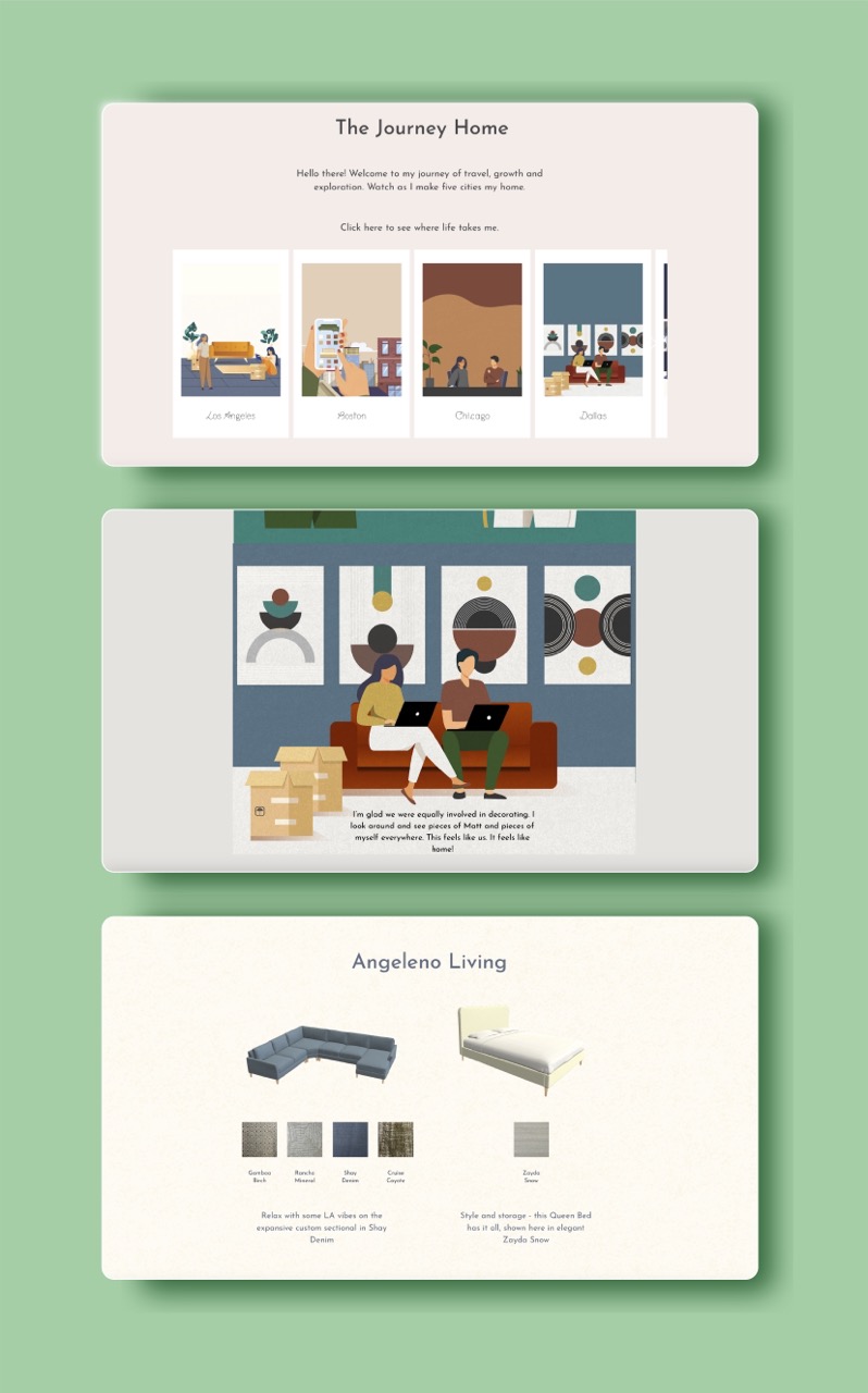 We began by crafting a narrative around the key furniture pieces in the physical showroom. Each furniture setting (or room) was a stop on the journey, which we brought to life on the website. Realizing that users would be navigating the site distracted and one-handed, we decided to keep navigation minimal with a continuous scroll. The illustration style and color palettes for the site were chosen to blend with each physical space, while simple animations make the story engaging. This creative approach to presenting furniture received significant attention and praise at the furniture show.