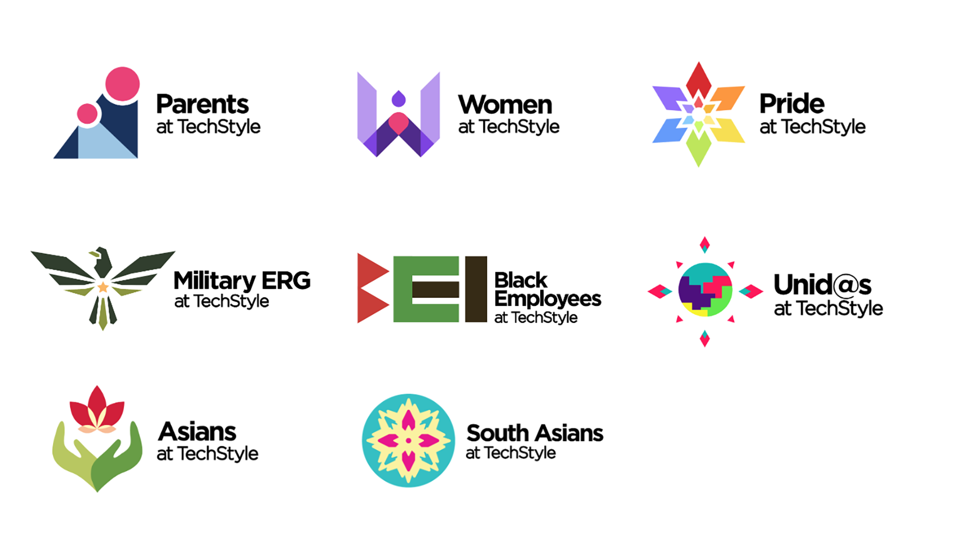 Design Lab was hired to create a visually interconnected suite of logos for the Employee Resource Groups at TechStyle. Presented as a group, these logos embody the spirit of unity and inclusion—core values of TechStyle. Individually, these logos celebrate the unique attributes of the groups they represent.